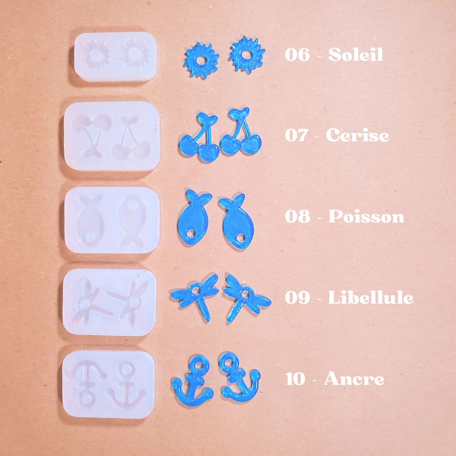 Des difficultés pour comprendre comment choisir vos moules ? Voici un exemple : pour que le kit contienne un moule Ancre, Goutte, Cerise, Erable, Poisson et Trèfle, notez dans le champ “moule” les chiffres : 10, 17, 07, 11, 08, 03.