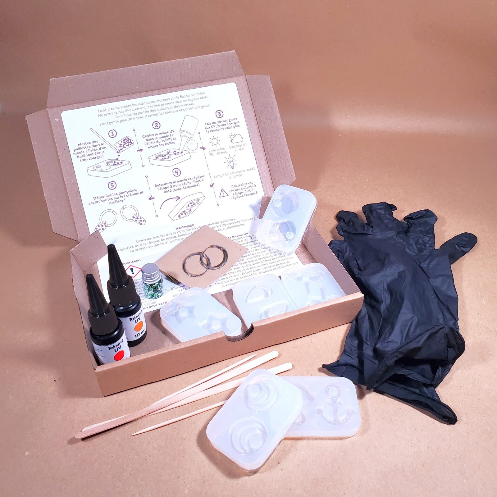 Attention : Respectez les précautions d’emploi. Ce kit ne convient pas pour les enfants à cause de la présence de la résine. Il est fortement recommandé d’utiliser ce kit dans une pièce bien aérée, loin des enfants ou des animaux, ou de porter un masque si vous avez des contre-indications médicales. Portez des gants lors de l’utilisation de la résine. En cas de doutes, lisez la fiche de sécurité.